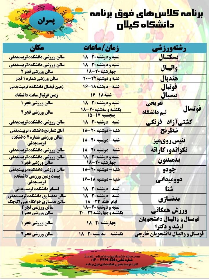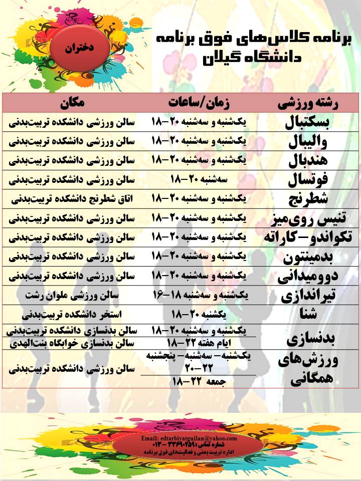 مسابقات ورزشی به مناسبت هفته تربیت بدنی دختران مسابقات ورزشی به مناسبت هفته تربیت بدنی پسران برنامه کلاس های فوق برنامه پسران برنامه کلاس های فوق برنامه دختران