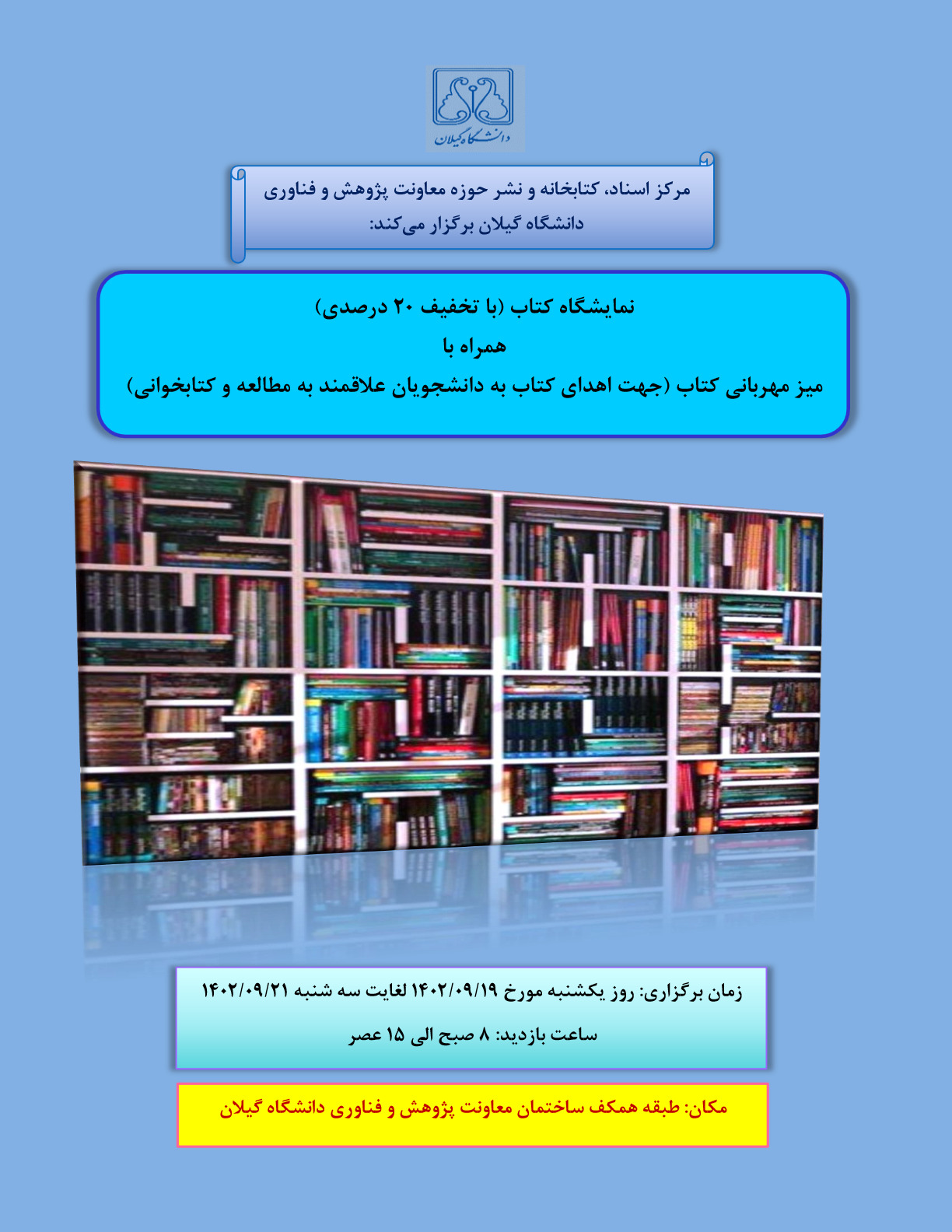 مرکز اسناد، کتابخانه و نشر معاونت پژوهش و فناوری دانشگاه به مناسبت هفته پژوهش و فناوری سال 1402 دانشگاه، نمایشگاه کتاب با تخفیف 20 درصدی، همراه با "میز مهربانی کتاب" جهت اهدای کتاب به دانشجویان علاقمند به مطالعه و کتابخوانی، از روز یکشنبه 1402/09/19 تا سه شنبه 1402/09/21 به مدت سه روز، در طبقه همکف ساختمان این معاونت برگزار می نماید.