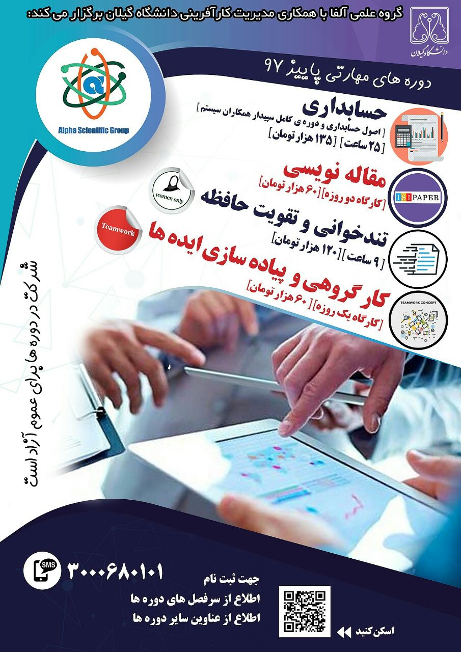مدیریت کارآفرینی و ارتباط با جامعه دانشگاه گیلان با همکاری گروه علمی آلفا در پاییز ۹۷ دوره های آموزشی گوناگونی را برگزار می نماید.