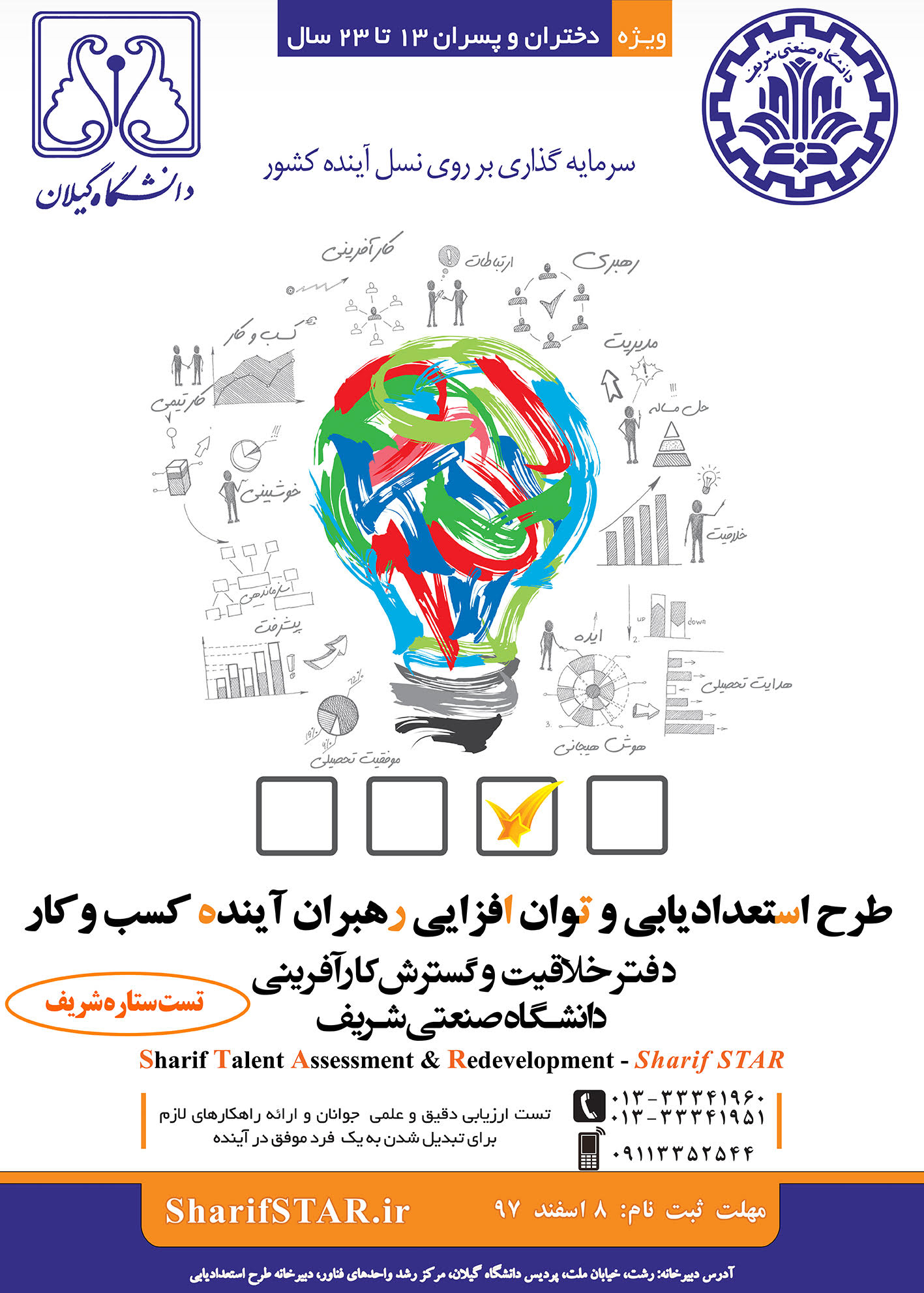 دانشگاه صنعتی شریف قصد دارد با همکاری مدیریت کارآفرینی و ارتباط با جامعه دانشگاه گیلان در استان گیلان تستی جامع تحت عنوان "ستاره شریف" (استعدادیابی و توان افزایی رهبران آینده) را در بین دختران و پسران و با تمرکز بر گروه سنی 13 الی 23 سال در تاریخ 10 اسفند سال 97 برگزار نماید. ستاره شریف با سنجش و ارزیابی ناخودآگاه افراد (در مقایسه با دیگران)، نقاط ضعف و قوت افراد را به تشریح بیان می کند، و راهکارهایی عملیاتی به منظور تقویت نقاط قوت هر فرد و اصلاح نقاط ضعف ایشان را تبیین می کند.