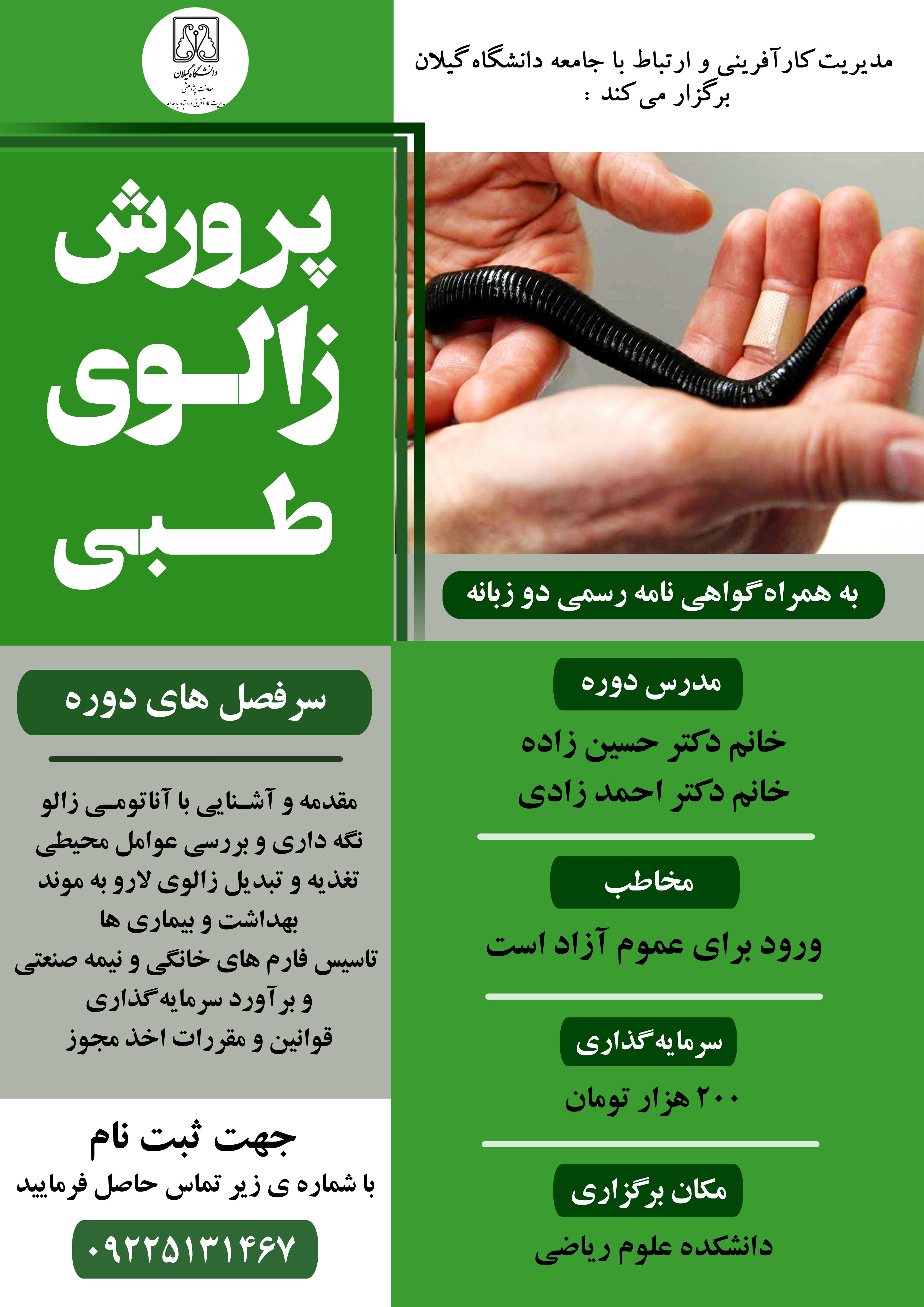 دوره آموزشی و مهارتی "پرورش زالو طبی" توسط مدیریت کارآفرینی و ارتباط با جامعه به منظور آشنایی دانشجویان علاقمند به نحوه ورود به بازار و فرآیند و مقررات اخذ مجوزات قانونی پرورش زالو و ... برگزار می شود. علاقمندان به شرکت در این دوره می توانند با شماره مندرج درپوستر تماس حاصل فرمایند.