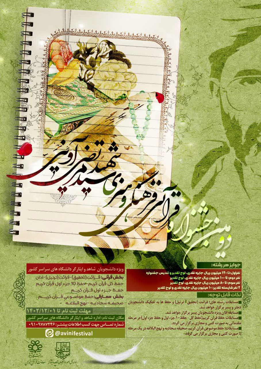 به منظور ترویج و تبیین فرهنگ شهادت و ایثار، ارائه تصویر صحیح از فضای قرآنی و دینی دانشگاههای سراسر کشور، دومین جشنواره قرآنی، فرهنگی و هنری شهید آوینی، ویژه دانشجویان شاهد و ایثارگر، در بخشهای زیر برگزار میشود: