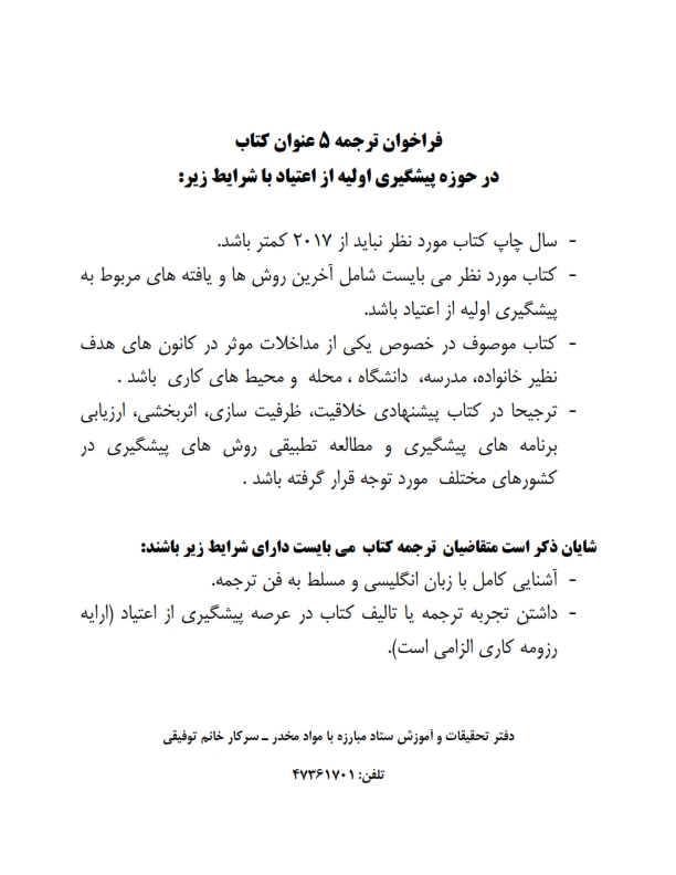 فراخوان ترجمه 5 عنوان کتاب در حوزه پیشگیری اولیه از اعتیاد