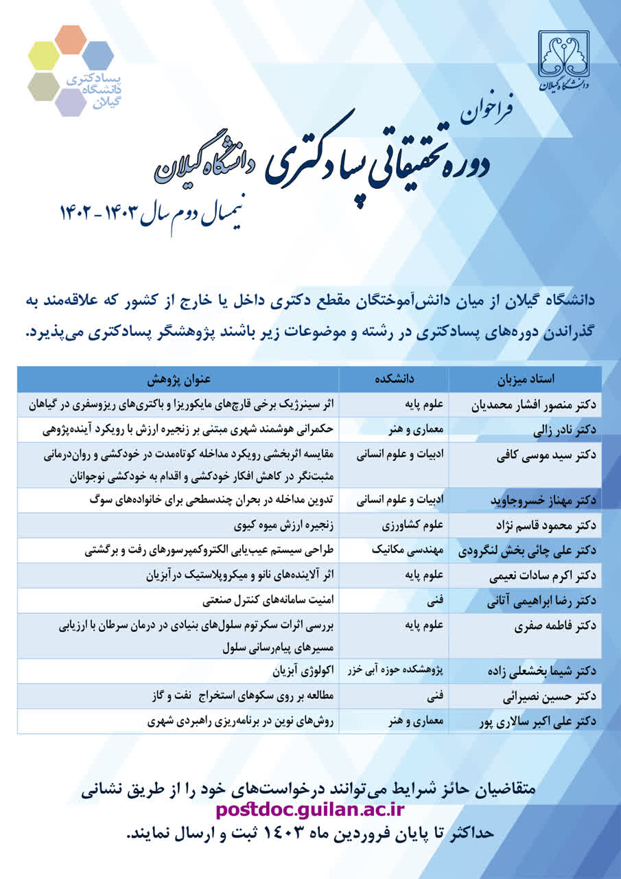 دانشگاه گیلان در راستای استفاده از ظرفیت های نخبگان و فارغ التحصیلان جوان، از میان دانشآموختگان مقطع دکتری داخل یا خارج از کشور و علاقهمند به گذراندن دوره تحقیقاتی پسادکتری، در نیمسال دوم سال تحصیلی 1403-1402 پژوهشگر میپذیرد. متقاضیان حائز شرایط میتوانند درخواستهای خود را از طریق نشانی postdoc.guilan.ac.ir حداکثر تا پایان فروردین ماه 1403 ثبت و ارسال نمایند.