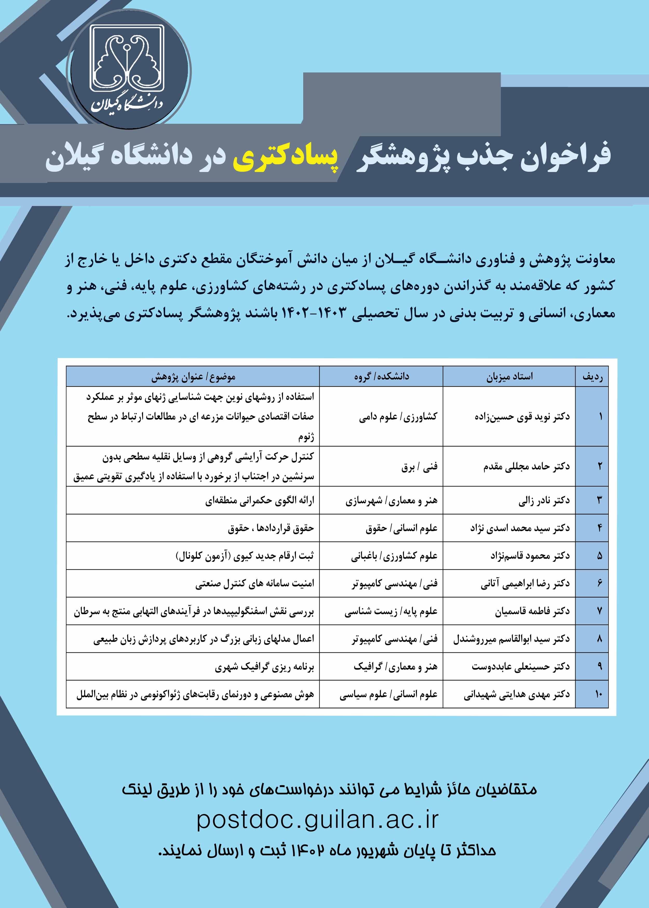 دانشگاه گیلان درنظر دارد در راستای استفاده از ظرفیتهای نخبگان و فارغالتحصیلان جوان، از میان دانشآموختگان مقطع دکتری داخل یا خارج از کشور که علاقهمند به گذراندن دورههای پسادکتری در رشتههای کشاورزی، علوم پایه، فنی، هنر و معماری، انسانی و تربیت بدنی در سال تحصیلی 1402-1403 باشند پژوهشگر پسادکتری میپذیرد. متقاضیان حائز شرایط میتوانند درخواستهای خود را از طریق لینک postdoc.guilan.ac.ir حداکثر تا پایان شهریورماه 1402 ثبت و ارسال نمایند.