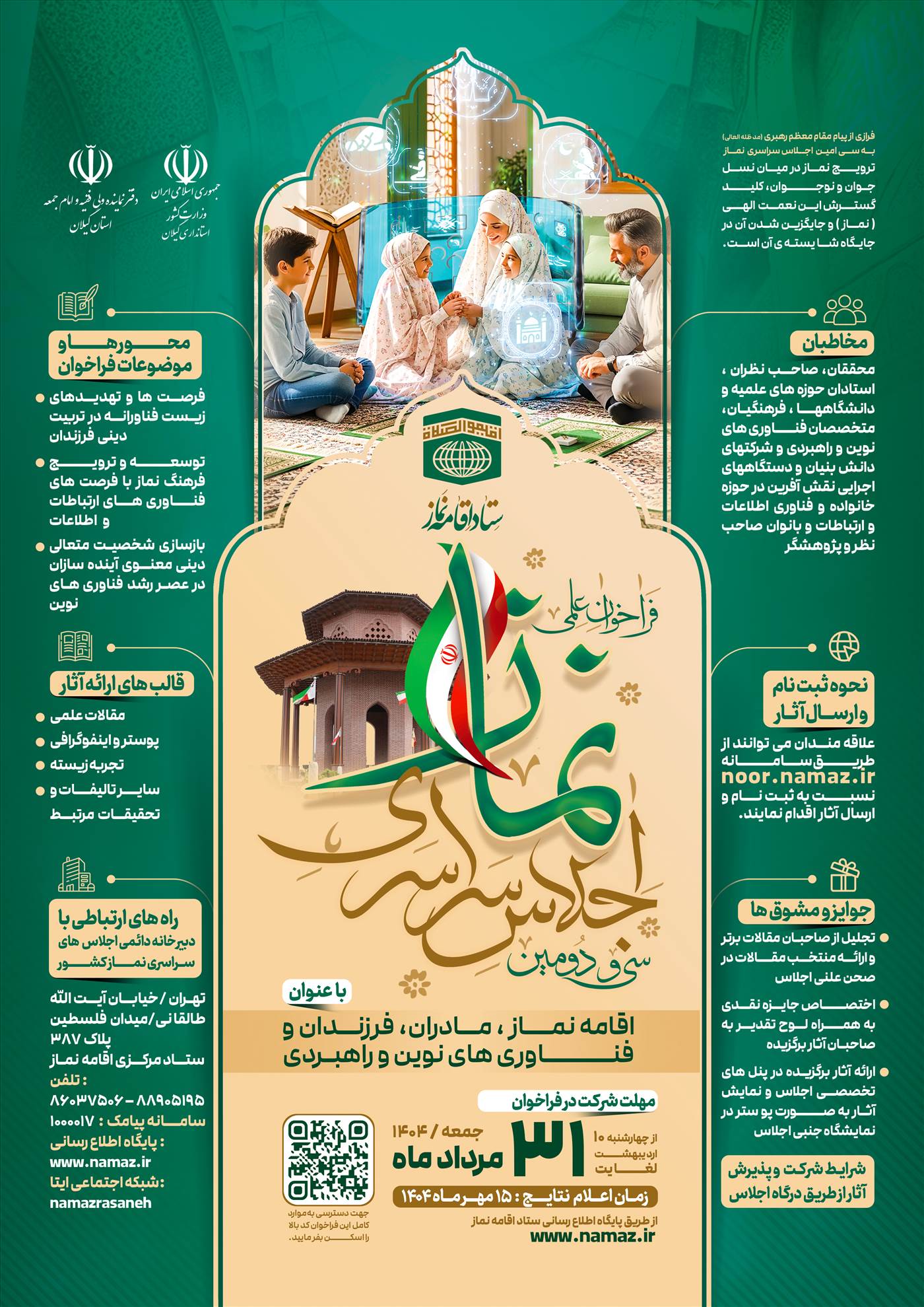 سی‌ودومین اجلاس سراسری نماز با موضوع «اقامه نماز، مادران، فرزندان و فناوری‌های نوین و راهبردی» در 17 مهرماه ۱۴۰۴ به میزبانی استان گیلان برگزار می شود. دکتر علی باستی، سرپرست دانشگاه گیلان و مسئول کمیته علمی اجلاس، با اشاره به اهمیت این رویداد گفت: «نماز، ستون هویت دینی و فرهنگی است و در عصر فناوری‌های نوین، باید با بهره‌گیری از ابزارهای ارتباطی و ظرفیت‌های علمی، آن را در متن زندگی نسل آینده جاری ساخت و دانشگاه‌ها در این مسیر، نقش راهبردی و تمدن‌ساز دارند. دکتر باستی با بیان اینکه دبیرخانه اجلاس تاکنون ۱۴۲۲ اثر از سراسر کشور دریافت کرده است، افزود: پس از ارزیابی اولیه، ۷۲۳ اثر در قالب‌های مقاله، پوستر، اینفوگرافی، تجربه زیسته و سایر تألیفات مرتبط برای داوری نهایی انتخاب شده‌اند که نشان از استقبال گسترده نخبگان علمی و فرهنگی کشور دارد. مسئول کمیته علمی سی‌ودومین اجلاس سراسری نماز گفت: محورهای علمی اجلاس شامل بررسی فرصت‌ها و تهدیدهای زیست فناورانه در تربیت دینی فرزندان، توسعه و ترویج فرهنگ نماز با بهره‌گیری از فناوری‌های ارتباطات و اطلاعات، و بازسازی شخصیت متعالی دینی و معنوی آینده‌سازان در عصر رشد فناوری‌های نوین است. دکتر باستی همچنین با اشاره به مشارکت فعال استان گیلان در این رویداد، اظهار داشت: استان گیلان رتبه دوم ارسال آثار را در میان استان‌های کشور به خود اختصاص داد. سرپرست دانشگاه گیلان افزود: برای نخستین‌بار و با پیگیری‌های مستمر دانشگاه گیلان، مجوز مؤسسه استنادی و پایش علم و فناوری جهان اسلام (ISC) برای این اجلاس اخذ شد که گامی مهم در ثبت و اعتباربخشی علمی آثار اجلاس محسوب می‌شود.