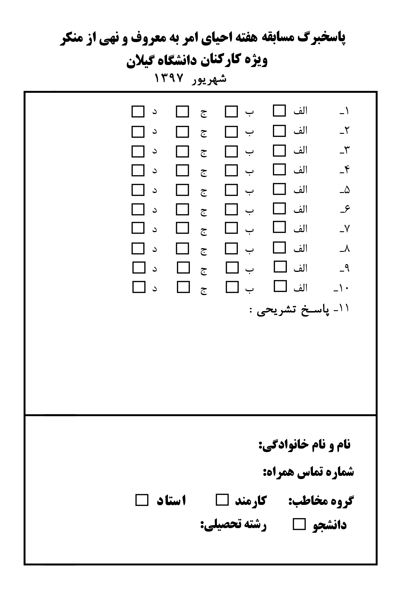 ضمن عرض تسلیت فرارسیدن ایام سوگواری حضرت اباعبدالله الحسین علیهالسلام، به اطلاع کلیه دانشگاهیان محترم دانشگاه گیلان می رساند،با عنایت به فراخوان مسابقه ستاد احیای امر به معروف ونهی از منکر استان گیلان به مناسبت گرامی داشت هفته ی احیای امر به معروف و نهی از منکر، مسابقه فرهنگی برگزار می گردد. علامندان می توانند جهت شرکت در این مسابقه، سؤالات را دریافت نموده و پاسخ برگ را تا تاریخ ۹۷/۰۶/۲۶ به دفتر معاونت فرهنگی و اجتماعی دانشگاه گیلان و یا به آدرس الکترونیکی farhangi@guilan.ac.ir ارسال نمایند. شایان ذکر است به قید قرعه به برگزیدگان جوایزی نفیس اهدا می گردد.