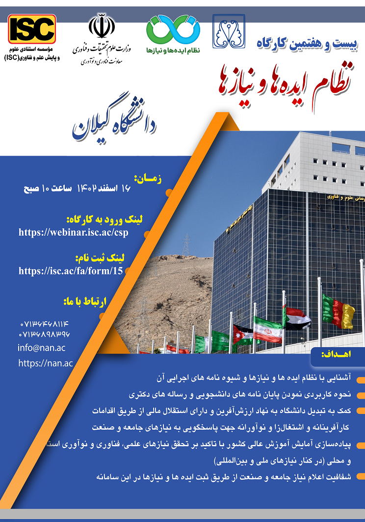 بر اساس پیگیریهای بعمل آمده از سوی دفتر ارتباط با جامعه و صنعت با تیم سرپرستی سامانه نظام ایدهها و نیازها (نان)، کارگاه آشنایی با این سامانه به طور اختصاصی برای اعضای هیات علمی دانشگاه گیلان در تاریخ 16 اسفندماه 1402، ساعت 10 صبح به صورت مجازی برگزار خواهد شد. لذا از همکاران محترم تقاضا میگردد به منظورآشنایی با روند ثبت ایده و نیاز در این سامانه، قوانین حاکم بر طرح استاد محوری سامانه نان و همچنین پرسش و پاسخ در زمینه مشکلات کار با سامانه در این کارگاه شرکت نمایند.
