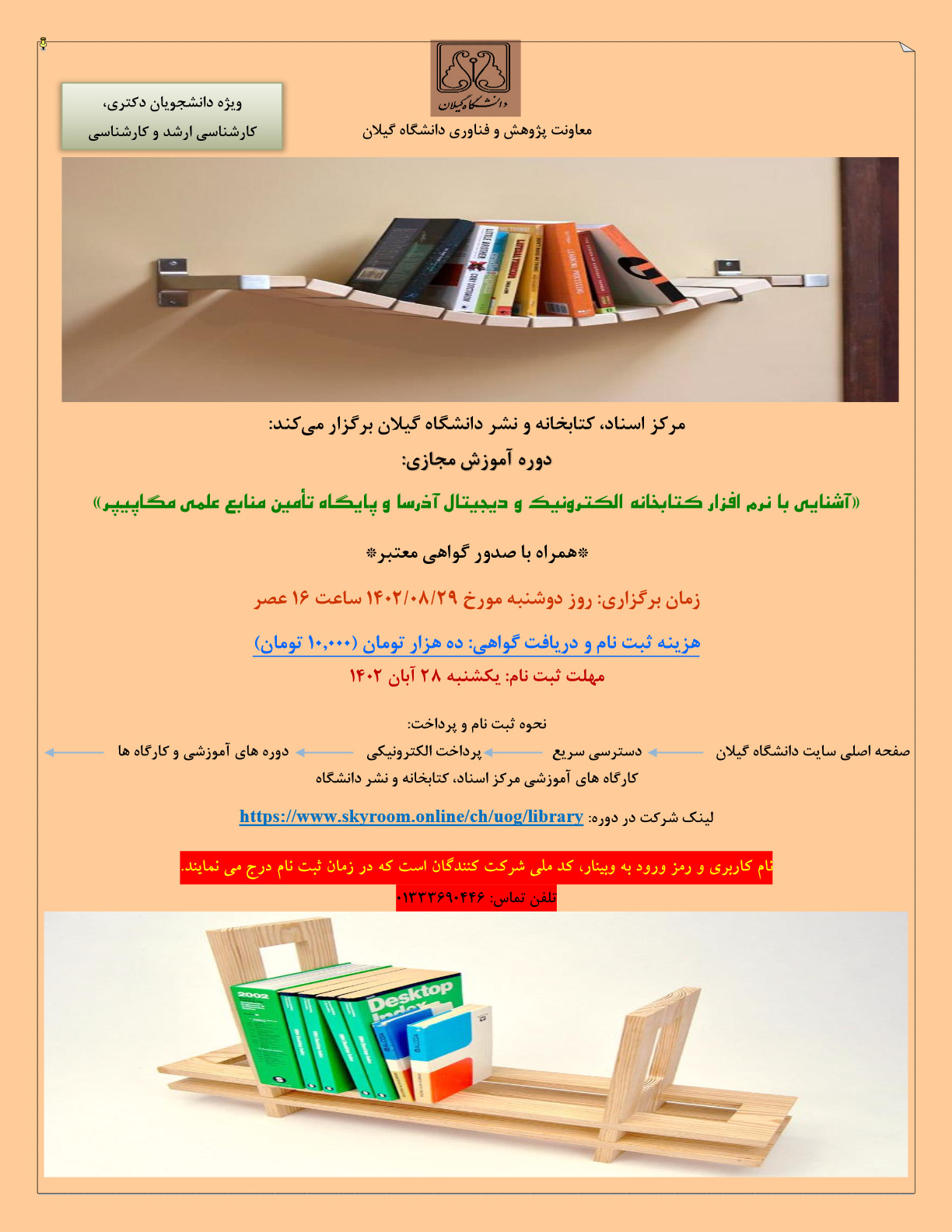 مرکز اسناد، کتابخانه و نشر حوزه معاونت پژوهش و فناوری دانشگاهT کارگاه آموزش مجازی با عنوان «آشنایی با نرم افزار کتابخانه الکترونیک و دیجیتال آذرسا و پایگاه تأمین منابع علمی مگاپیپر» را در روز دوشنبه 1402/08/29 از ساعت 16 الی 18 عصر، برای دانشجویان تمامی مقاطع تحصیلی برگزار می نماید. شرکت در دوره: