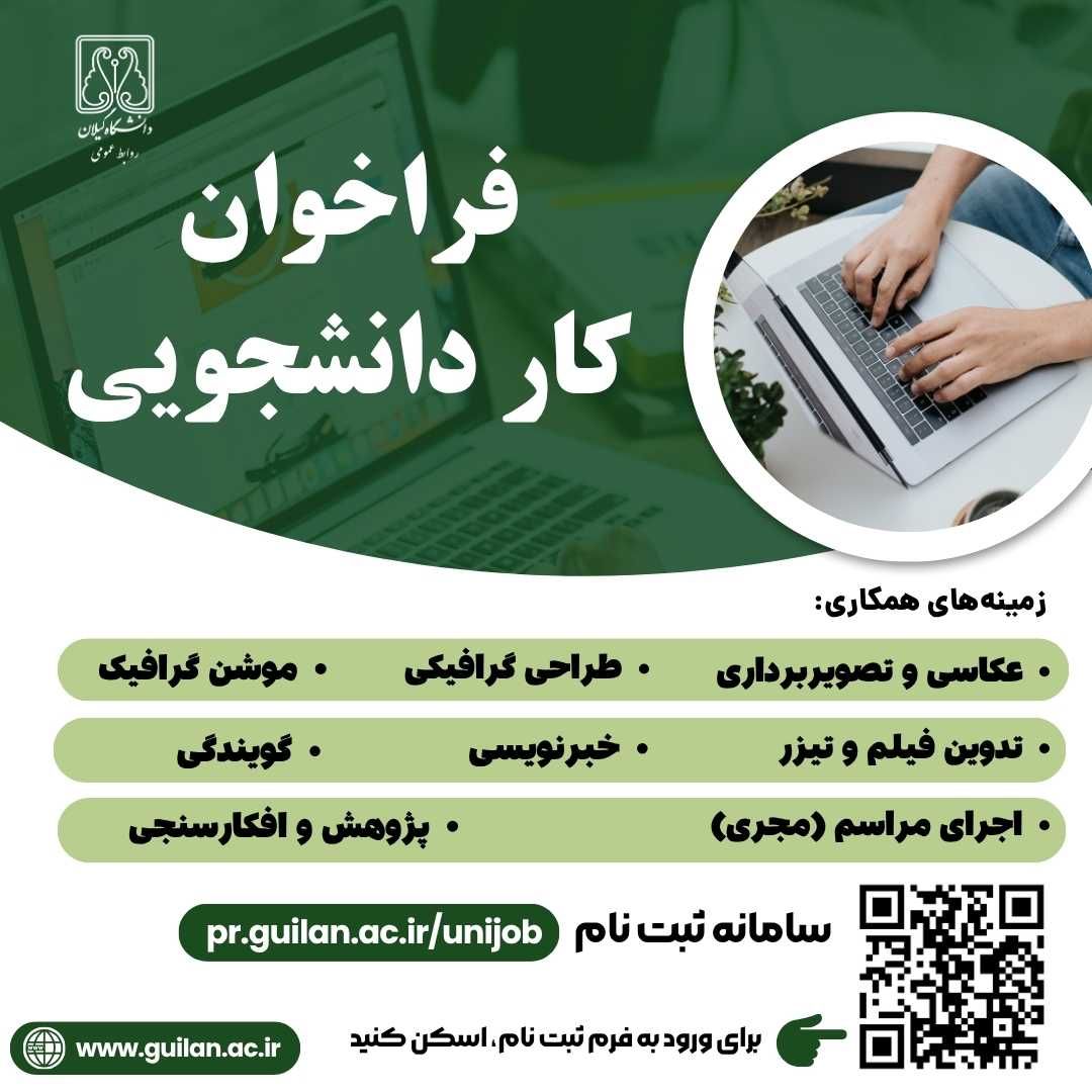 روابط عمومی دانشگاه گیلان از بین دانشجویان توانمند و علاقه‌مند در زمینه‌های زیر، به عنوان کار دانشجویی دعوت به همکاری می‌نماید.