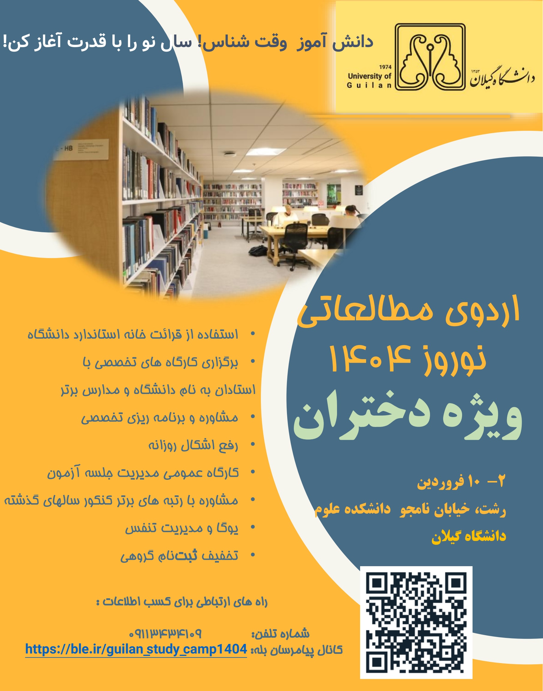 به منظور خدمت رسانی کارآمد به دانش اموزان و ارتقای سطح توانمندی ایشان در آزمون ورودی دانشگاه ها، اردوی مطالعاتی عیدانه در روزهای 2 تا 10 فروردین ماه 1404 برگزار می شود.