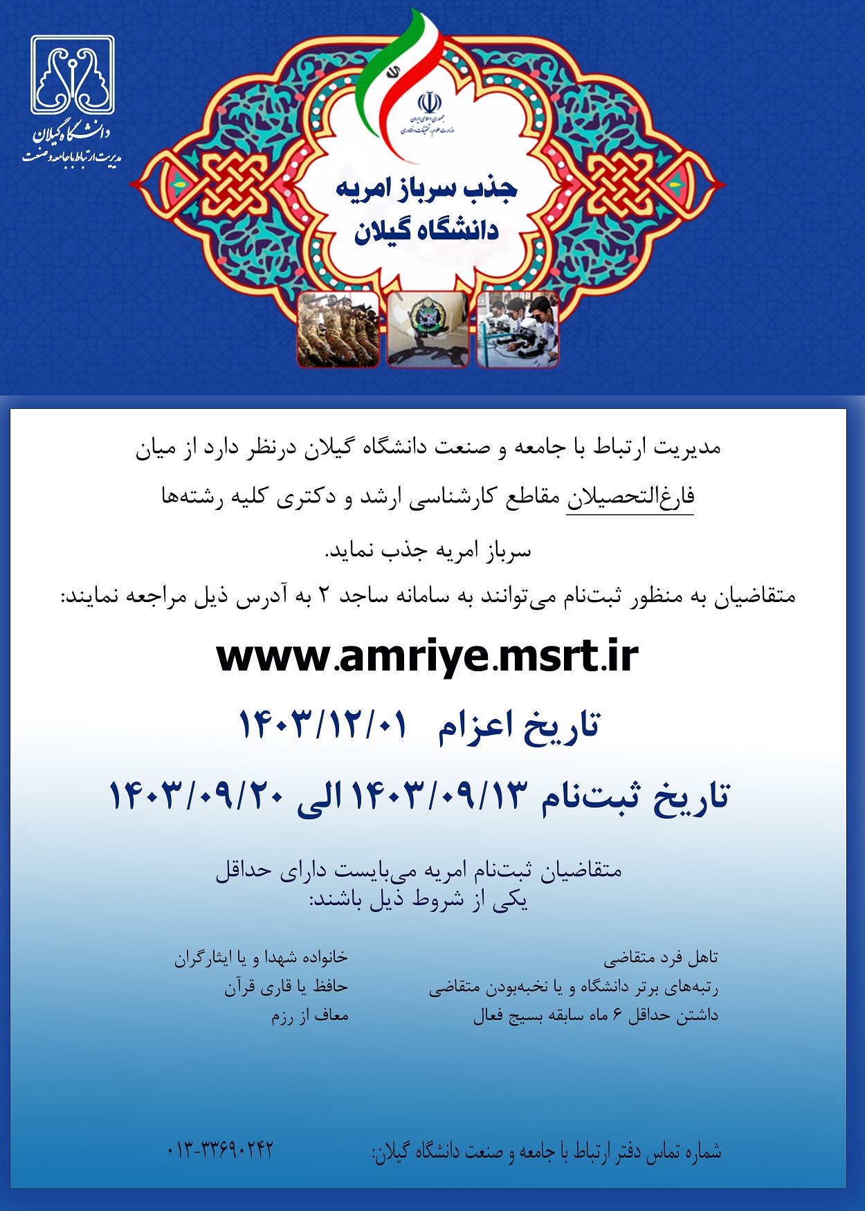 مدیریت ارتباط با جامعه و صنعت دانشگاه گیلان در نظر دارد از میان فارغالتحصیلان مقاطع کارشناسیارشد و دکتری کلیه رشتهها، سرباز امریه با تاریخ اعزام 1403/12/01 جذب نماید. متقاضیان به منظور ثبتنام میتوانند به سامانه ساجد 2 به آدرس amriye.msrt.ir مراجعه نمایند.