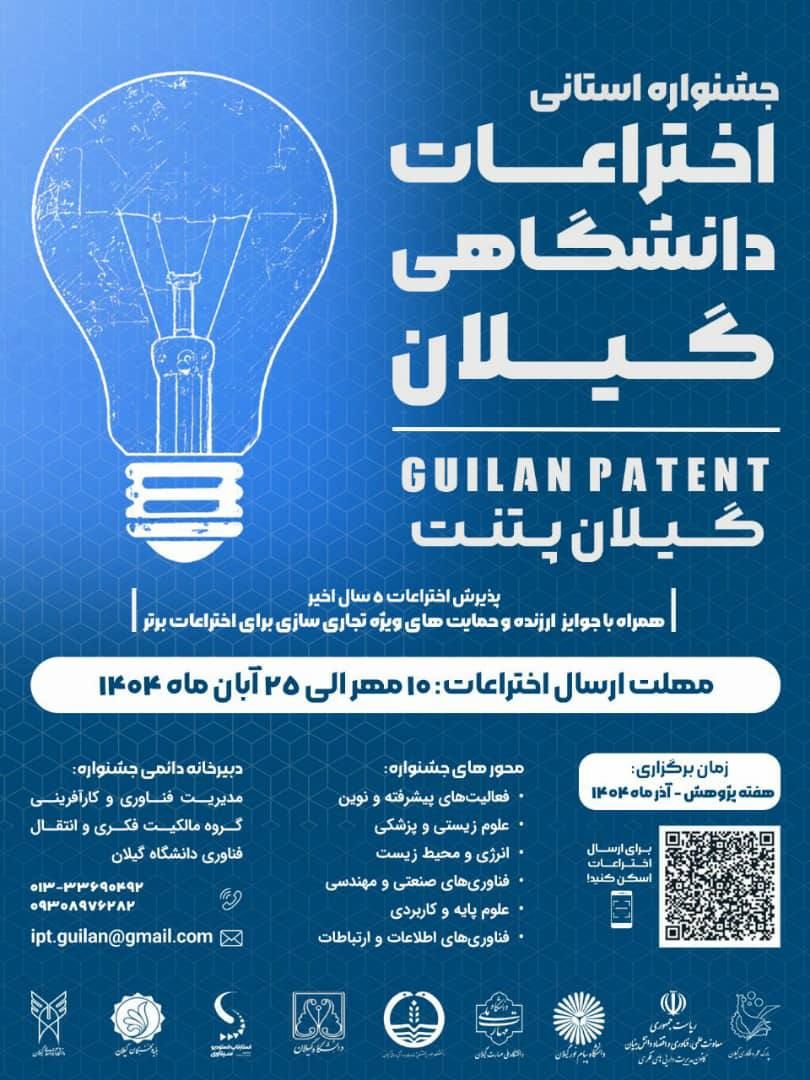 به اطلاع اعضای هیئت علمی، دانشجویان، پژوهشگران و مخترعان گرامی می‌رساند جشنواره استانی اختراعات دانشگاه گیلان (گیلان پتنت) در آذرماه سال‌جاری و همزمان با هفته پژوهش سال ۱۴۰۴ برگزار می‌شود.