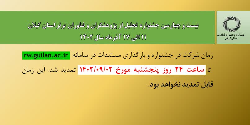 با عنایت به آغاز جشنواره پژوهش و فناوری استان گیلان در سال 1402 (11 تا 17 آذرماه)، اعضای هیات علمی علاقه مند به شرکت در جشنواره میتوانند ضمن مطالعه دقیق «شیوهنامه جشنواره پژوهش و فناوری استان گیلان» پس از دریافت معرفینامه از دانشگاه و یا سازمان خود، با مراجعه به سامانه rw.guilan.ac.ir نسبت به ثبتنام و بارگذاری مستندات از تاریخ 1402/08/23 حداکثر تا 1402/08/30 اقدام نمایند.