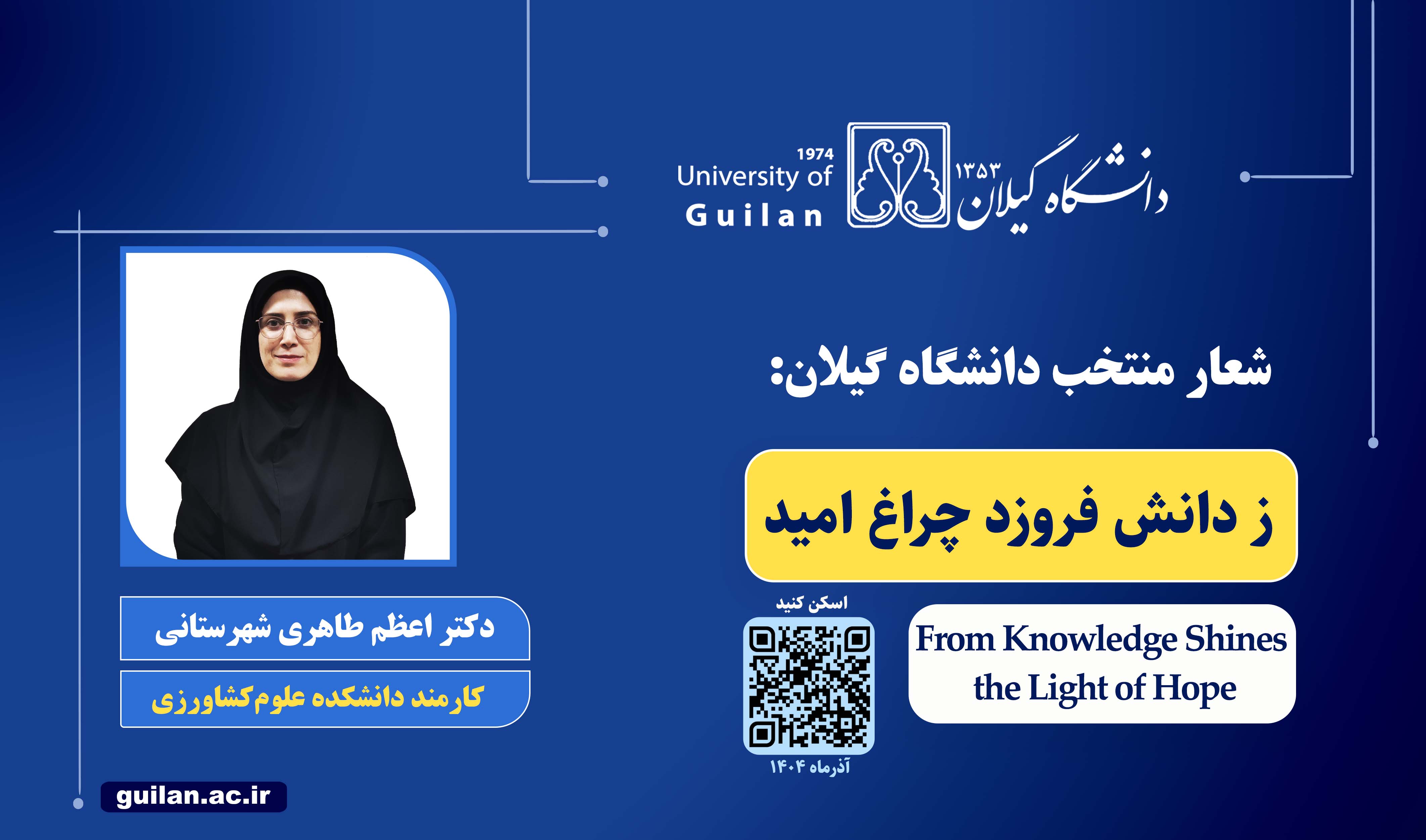 این شعار که توسط دکتر اعظم طاهری شهرستانی کارمند دانشکده علوم‌کشاورزی دانشگاه پیشنهاد شد، با هدف بازتاب رسالت دانشگاه در هویت‌سازی، امیدآفرینی و ترویج ارزش‌های علمی و فرهنگی به عنوان شعار رسمی دانشگاه گیلان برگزیده شد.