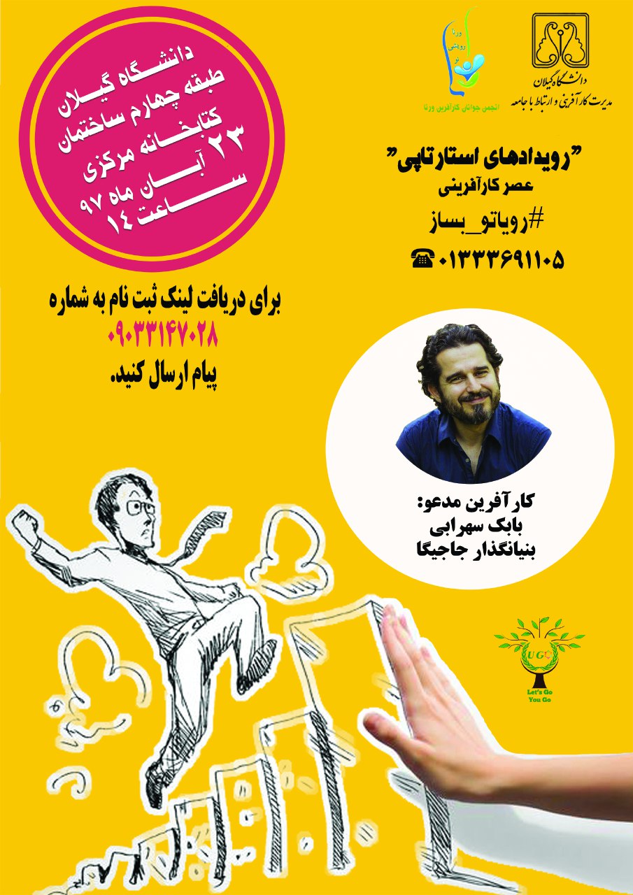 مدیریت کارآفرینی و ارتباط با جامعه دانشگاه در نظر دارد سومین رويداد استارت آپی را در روز چهارشنبه مورخ 1397/8/23 از ساعت 14 الی 17:30 در محل اتاق شورای معاونت پژوهشی برگزار نماید . از علاقمندان جهت شرکت در این رویداد دعوت به عمل می آید.