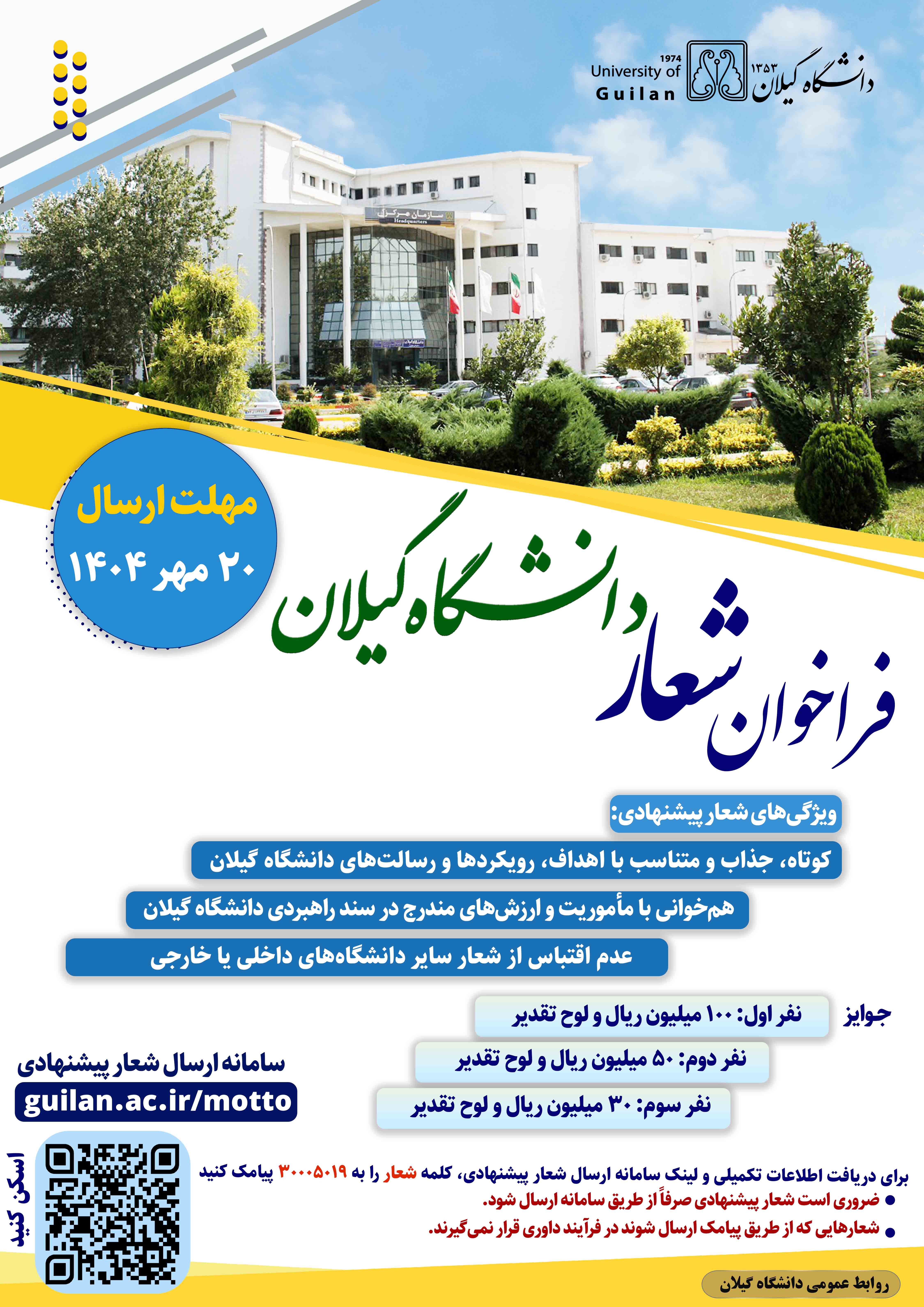 📌 از میان شعارهای ارسالی، سه پیشنهاد برتر توسط کارگروه تخصصی انتخاب خواهد شد که در نهایت، یکی از آنها بهعنوان شعار رسمی دانشگاه گیلان برگزیده میشود.