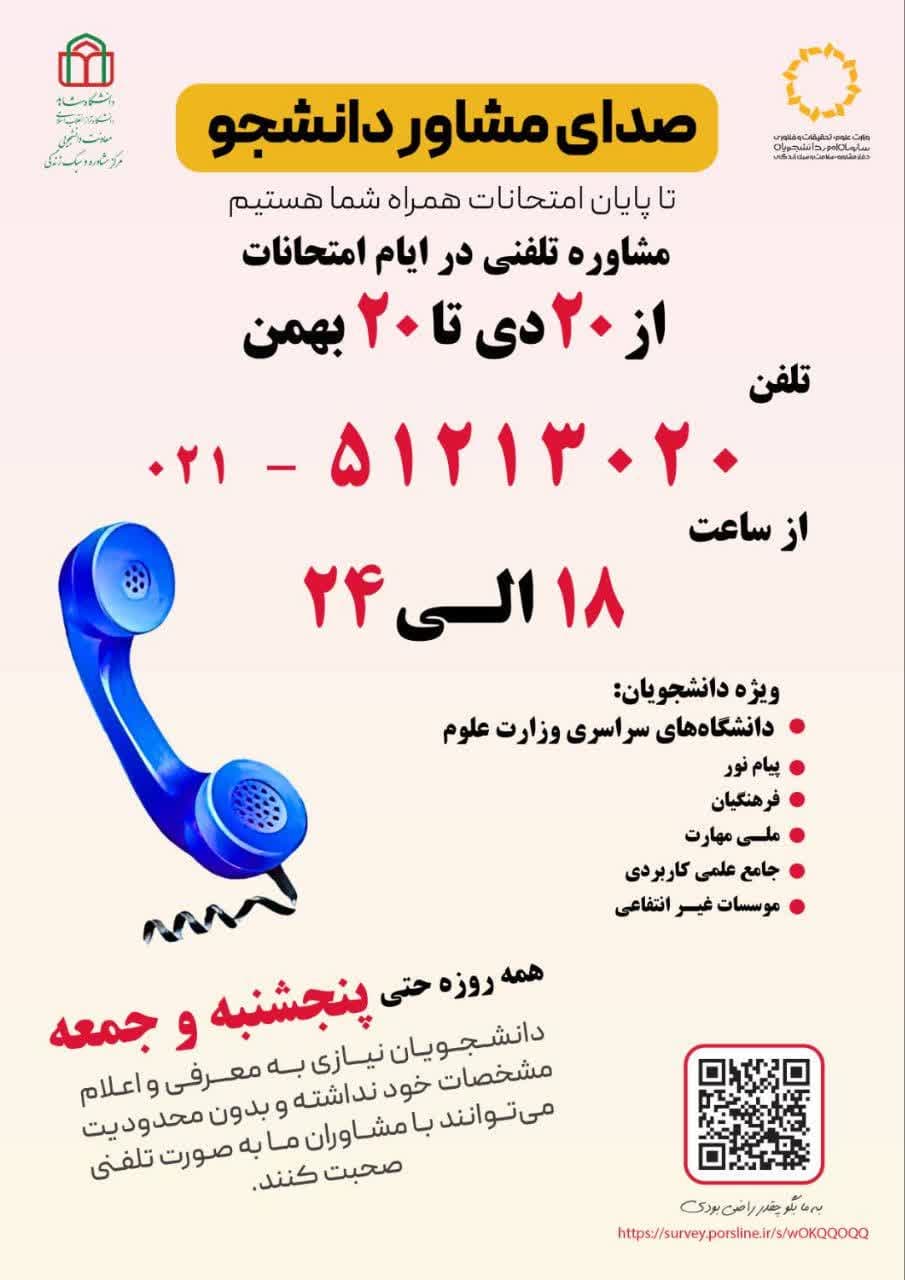 دفتر مشاوره، سلامت و سبک زندگی وزارت علوم، تحقیقات و فناوری با مشارکت مرکز مشاوره دانشگاه شاهد و همکاری مراکز مشاوره ای مناطق 10 گانه، طرح ارائه خدمات مشاوره تلفنی در ایام امتحانات را از تاریخ 20 دی تا 20 بهمن ماه به صورت برخط از ساعت 18 تا 24 برای بهره مندی دانشجویان سراسر کشور اجرا می نماید.