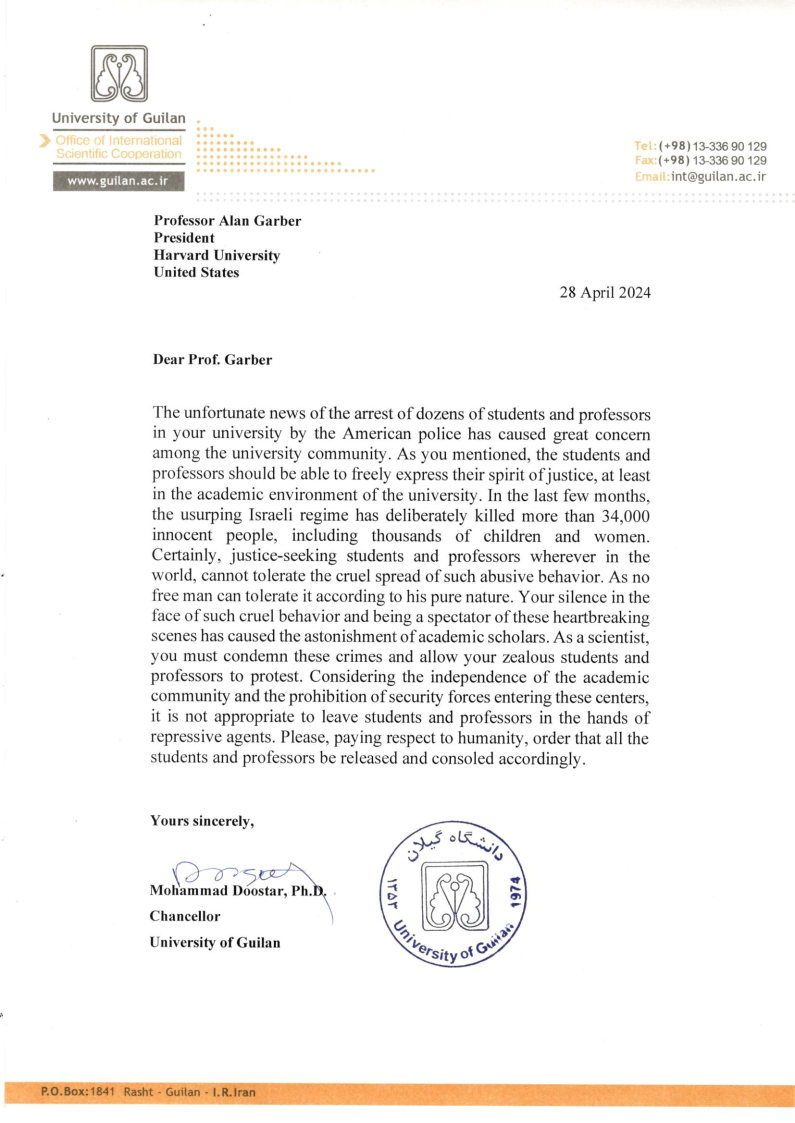 در پی دستگیری صدها دانشجوی حامی فلسطین در دانشگاه‌های آمریکا توسط پلیس آن کشور، سرپرست دانشگاه گیلان در حمایت از دانشجویان دستگیرشده و جنبش دانشجویی حمایت از فلسطین به 38 تن از رؤسای دانشگاه های ایالات متحده از جمله هاروارد، اموری، کلمبیا نامه‌ای ارسال کرد.