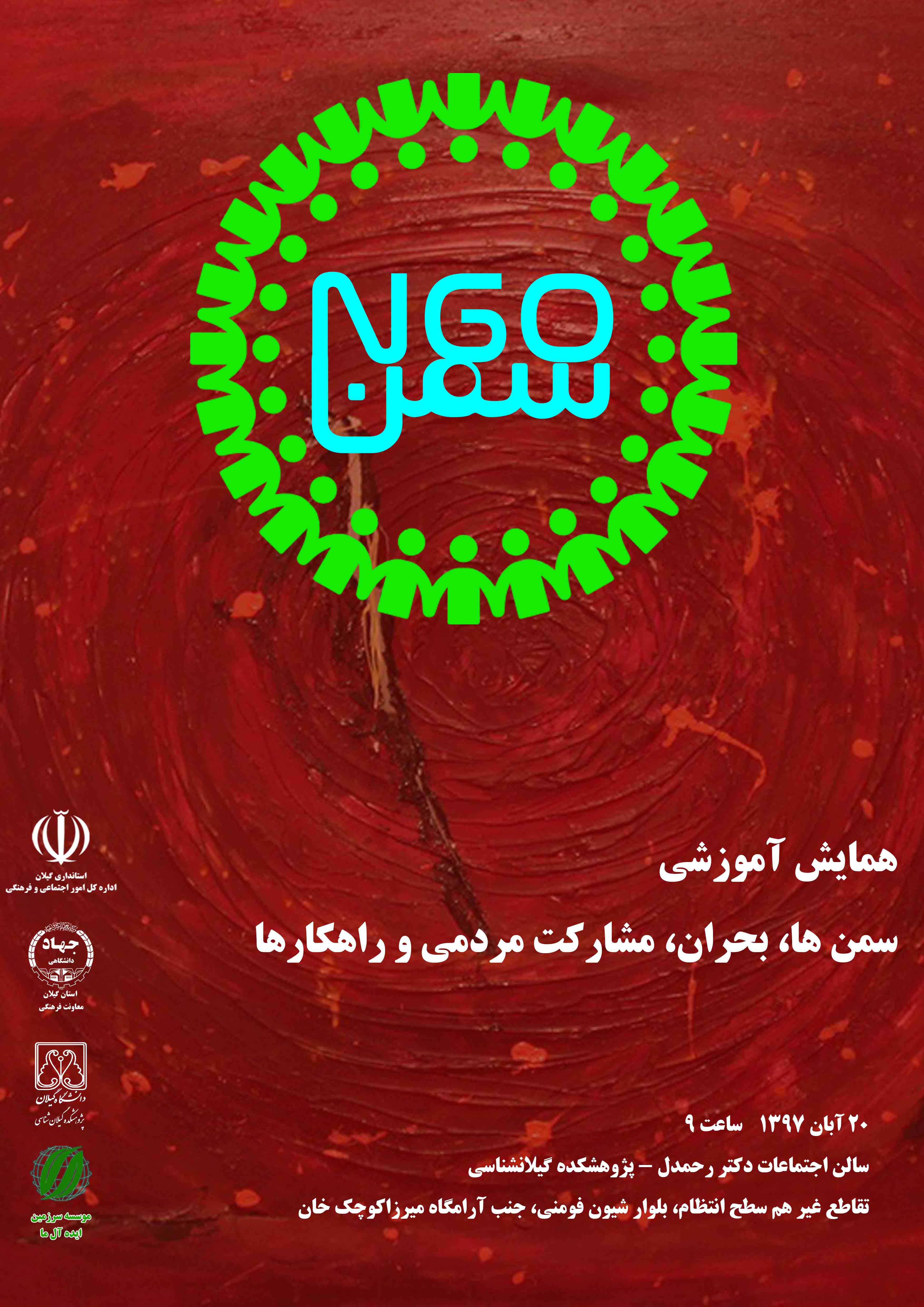 همایش آموزشی سمن ها، بحران، مشارکت مردمی و راهکارها زمان: یکشنبه ۲۰ آبان ساعت ۹ صبح مکان: پژوهشکده گیلان شناسی
