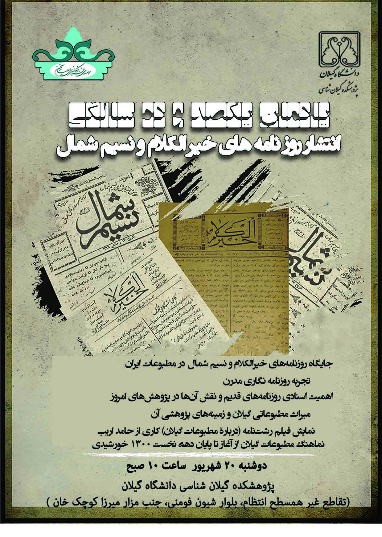 پژوهشکده گیلان شناسی در نظر دارد "یادمان یکصد و ده سالگی روزنامه های نسیم شمال و خیرالکلام" را روز دوشنبه 20 شهریور ساعت 10 در محل این پژوهشکده برگزار نماید.