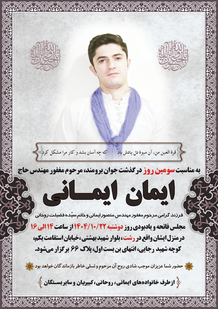 با نهایت تأسف درگذشت پسرِ گرامیتـان را تسلیت عرض نموده و از درگاه خـداوند متعـال برای آن مرحـوم، آرامش و غفـران الهی و برای بازماندگان صبـر و شکیبایی مسألت می‌نمایم.