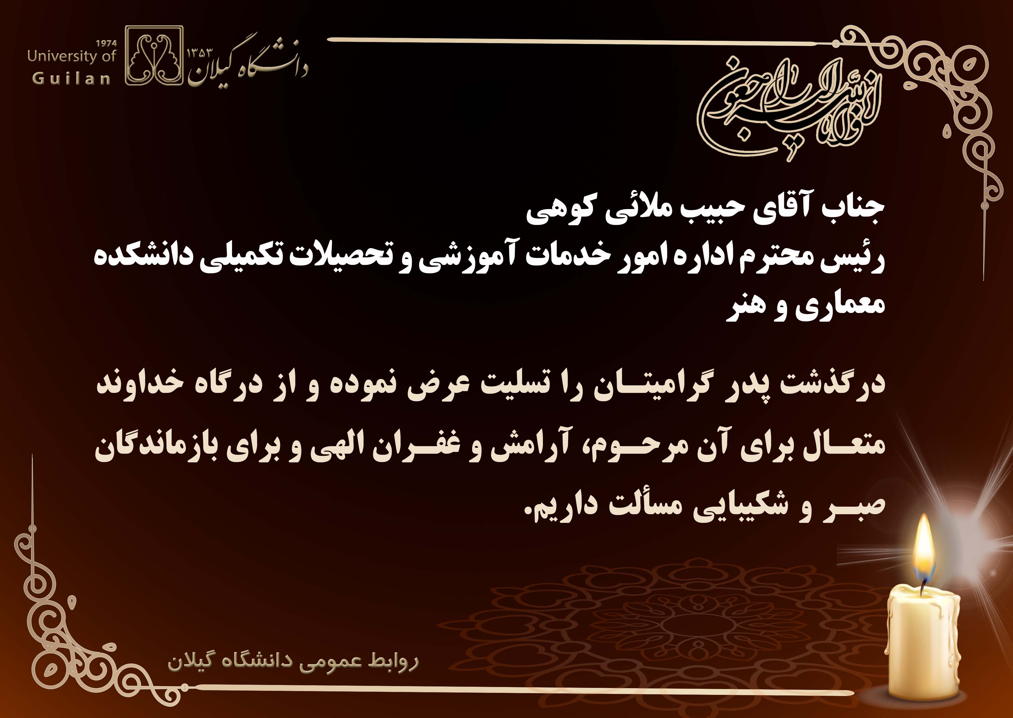 سرپرست دانشگاه گیلان در پیامی درگذشت پدرِ آقای حبیب ملائی کوهی رئيس اداره امور خدمات آموزشی و تحصيلات تکميلی دانشکده معماری و هنر را تسلیت گفت.