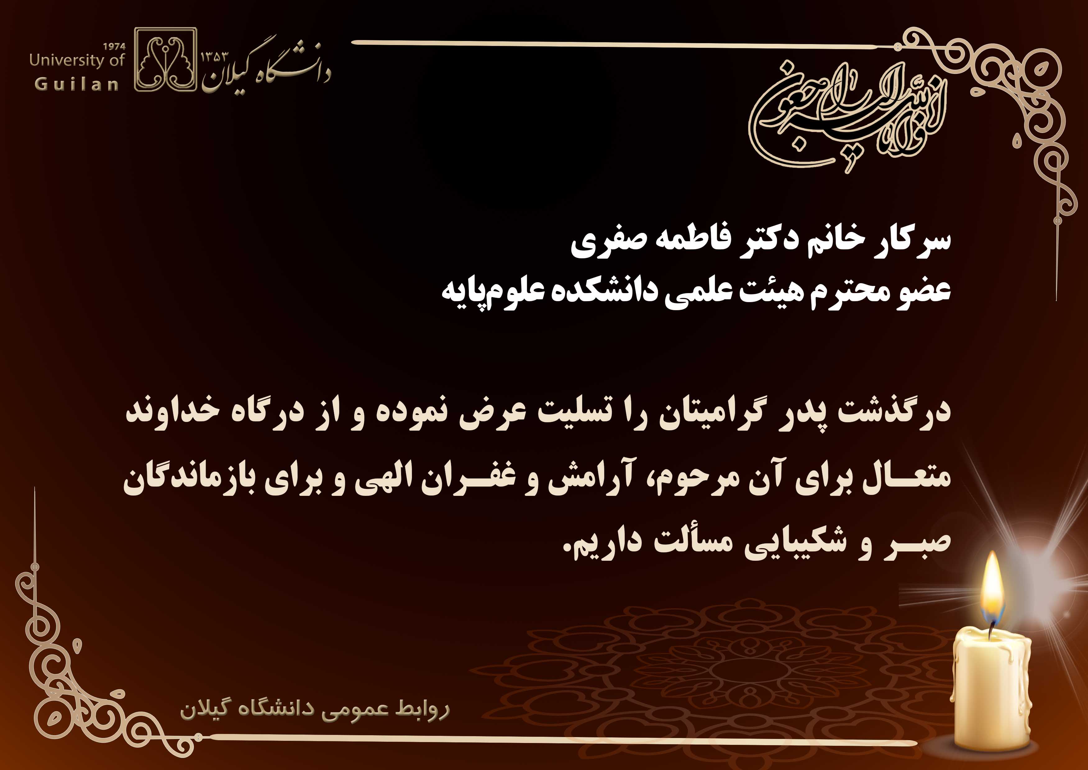سرپرست دانشگاه گیلان در پیامی درگذشت پدرِ دکتر فاطمه صفری عضو محترم هیئت علمی دانشکده علوم‌پایه را تسلیت گفت.