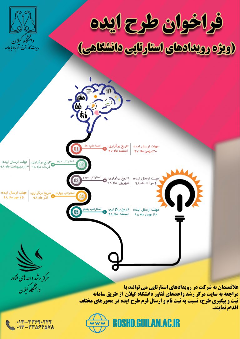 دانشگاه گیلان با هدف آموزش و ترویج کار آفرینی و رسیدن به مدلهای مناسب کسب و کار و در راستای حمایت از ایدههای خلاق و نوآور، سلسله رویدادهای استارتاپی دانشگاهی را برگزار می نماید. لینک ثبت نام: http://guilanroshd.ir/Registration